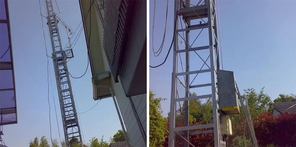 Acélszerkezetű függőleges létra biztonsági ketreccel |